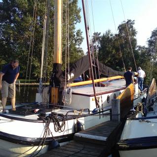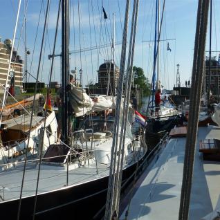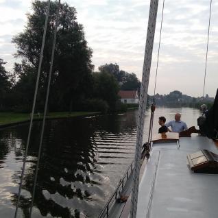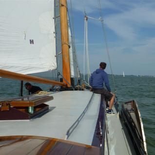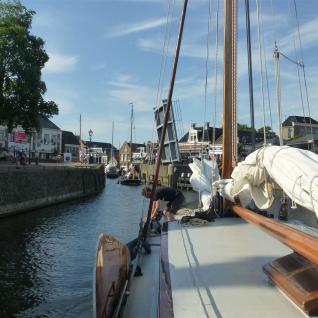 Wer viel vor hat, der muss auch früh aufstehen. So klingelte der Wecker bereits um 5:00 Uhr, noch vor dem ersten Hahnenschrei. Nach dem gemeinsamen Frühstück auf dem Schiff ging es dann endlich los. Bei dem Fahren eines Plattbodenschiffs gibt es schon so ein paar Besonderheiten. So übten wir zunächst das Anlegen bei verschiedenen Windverhältnissen, das Werfen von Leinen und die Bedienung der Seitenschwerter. In den Schleusen und in den teilweise engen Häfen ist keine Zeit für Experimente. Da muss dann einfach alles klappen. Auf dem Heeger Meer führten wir dann noch einige Manöver unter Segel durch, um dann nach Stavoren, dem Haupttor zum Ijsselmeer zu fahren. Nach dem Schleusen überquerten wir dann das Ijsselmeer und erreichten am frühen Abend das wunderschöne Hafenstädtchen Enkhuizen, das immer eine Reise wert ist. Hier verbrachten wir in wunderschönem Ambiente den restlichen Abend. Aufgrund des wirklich guten Wetters konnten wir in der Nacht draußen auf Deck unter freiem Himmel schlafen.